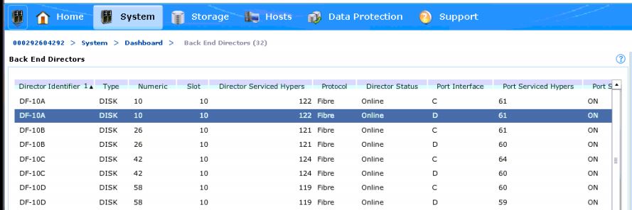 Here you see the 8 Director10 ports; physically there is only 2 backend ports on the director using QSFP it branches off to 4 connections to the system disk enclosures.