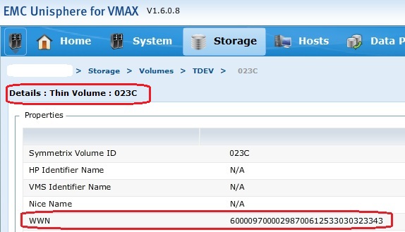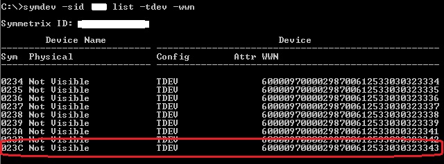 As can be seen from the output the matching VMAX Device name is 023C (TDEV):