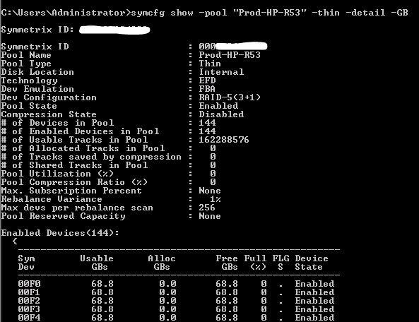 symcfg show -pool “Prod-HP-R53” -thin -detail -GB