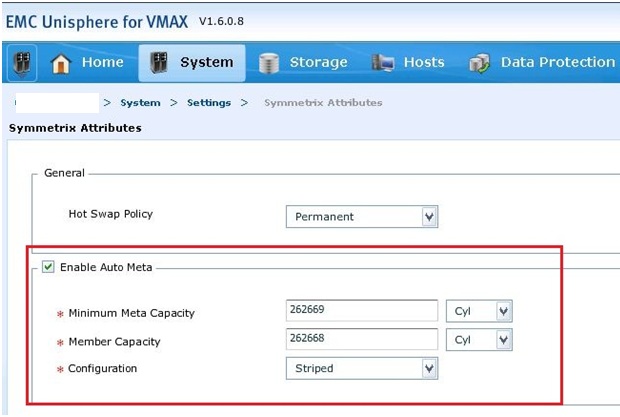 • min_auto_meta_size: this value is set by the user. This is the largest volume size that can be created before the Auto_Meta feature comes into play. When a user attempts to create a volume or volumes larger than the min_auto_meta_size and with auto_meta set to enabled what will result is the creation of a meta device. Thus the min_auto_meta_size is the size threshold that will trigger an Auto_Meta volume creation and any devices larger will automatically be a meta device. min_auto_meta_size needs to be less than or equal to the maximum defined value of 262669 cylinders (240GB) – these figures are for Enginuity Version 5874 and above.