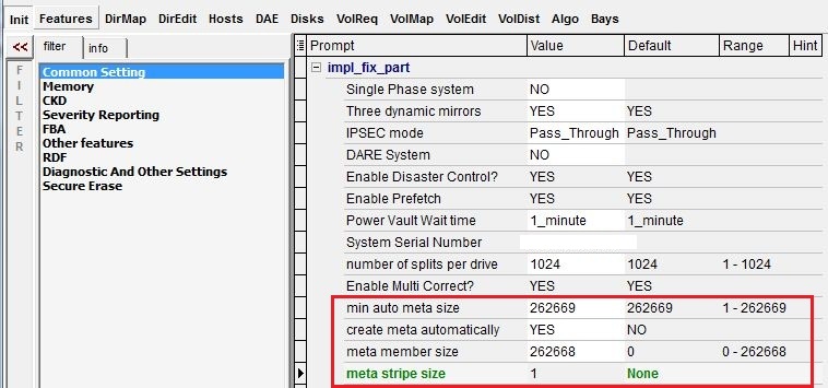 Note that it is possible using Symcli to manually configure meta volumes that ignore the Auto_Meta setting. Example creating a 4 way meta using volumes 100 – 103: