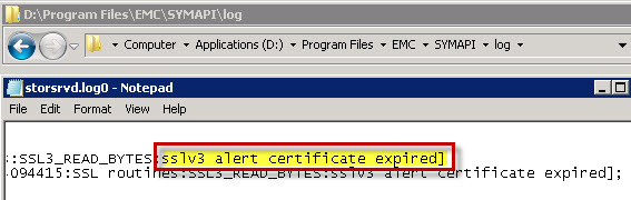 Open the storsrvd log file (drive letter:\Program Files\EMC\SYMAPI\log) and check for the error “sslv3 alert certificate expired”: