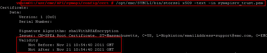 vmuim01:/usr/emc/API/symapi/config/cert # /opt/emc/SYMCLI/bin/storssl x509 -text -in symapisrv_trust.pem