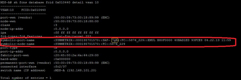 Somtimes you may have encountered an issue where a VNX/VMAX front-end port gets cabled to the wrong MDS Switch Port that you had designed for and in fact the port description that was applied to the MDS Port is incorrect. In this case it is invaluable to have a command to verify the VNX/VMAX port connected to the MDS. There are many situations where this command would be useful; for example you may not have the ability to do a physical check as the DC is remote and you need to ensure the interface description that you are assigning the MDS FC Port is correct and resulting zoning configurations are accurate. Confirming these connections remotely through a command on the MDS is very benneficial during these types of situations. Else you may end up zoning to ports you did not design for.