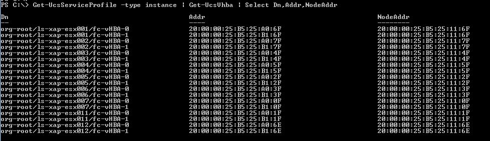 PS C:\> Get-UcsServiceProfile -type instance | Get-UcsVhba | Select Dn,Addr,NodeAddr