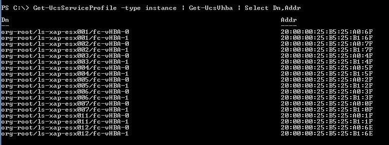 PS C:\> Get-UcsServiceProfile -type instance | Get-UcsVhba | Select Dn,Addr