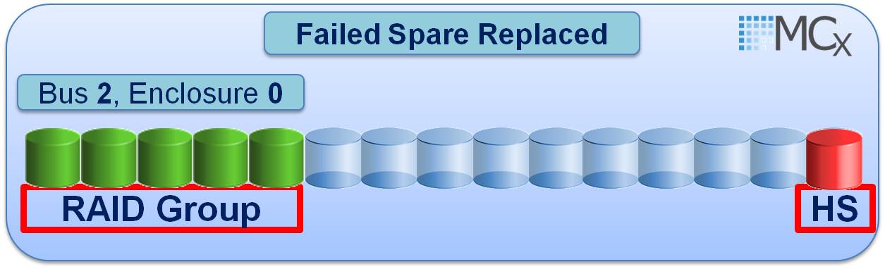 MCx has brought changes to the way Hot Sparing works in a VNX Array. Permanent Sparing is now the method used when a drive fails. How Permanent Sparing works: when a drive fails in a Raid Group (Traditional RG or Pool internal private RG) the RG rebuilds to a suitable spare drive in the VNX, this used Spare drive now becomes a permanent member of the RG. When the failed drive gets replaced then it becomes a Spare for eligible drives within the entire VNX Array. This new method of sparing eliminates the previous method used by Flare where the Hot Spare would equalize back to the original drive location (B_E_D) once the drive had been replaced.