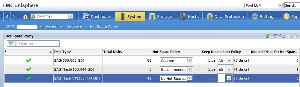 Best practice is to ensure 1 spare is available per 30 of each drive type. There is known bug with MCx Revision: 05.33.000.5.051 where recommended is displayed as 1/60 as you can see below, this is due to be fixed with the next release to reflect the 1/30 ratio. The three policy options are Recommended, Custom or NO Hot Spare. If the ‘No Hot Spare’ option is chosen this does not necessarily mean that no HS will be used, the system will spare to a drive in the system if a suitable match is found; this option just allows the user to configure all available drives of this type for use within Raid Groups. You can either use CLI or Unsphere to analyse the Policies defined on the array: