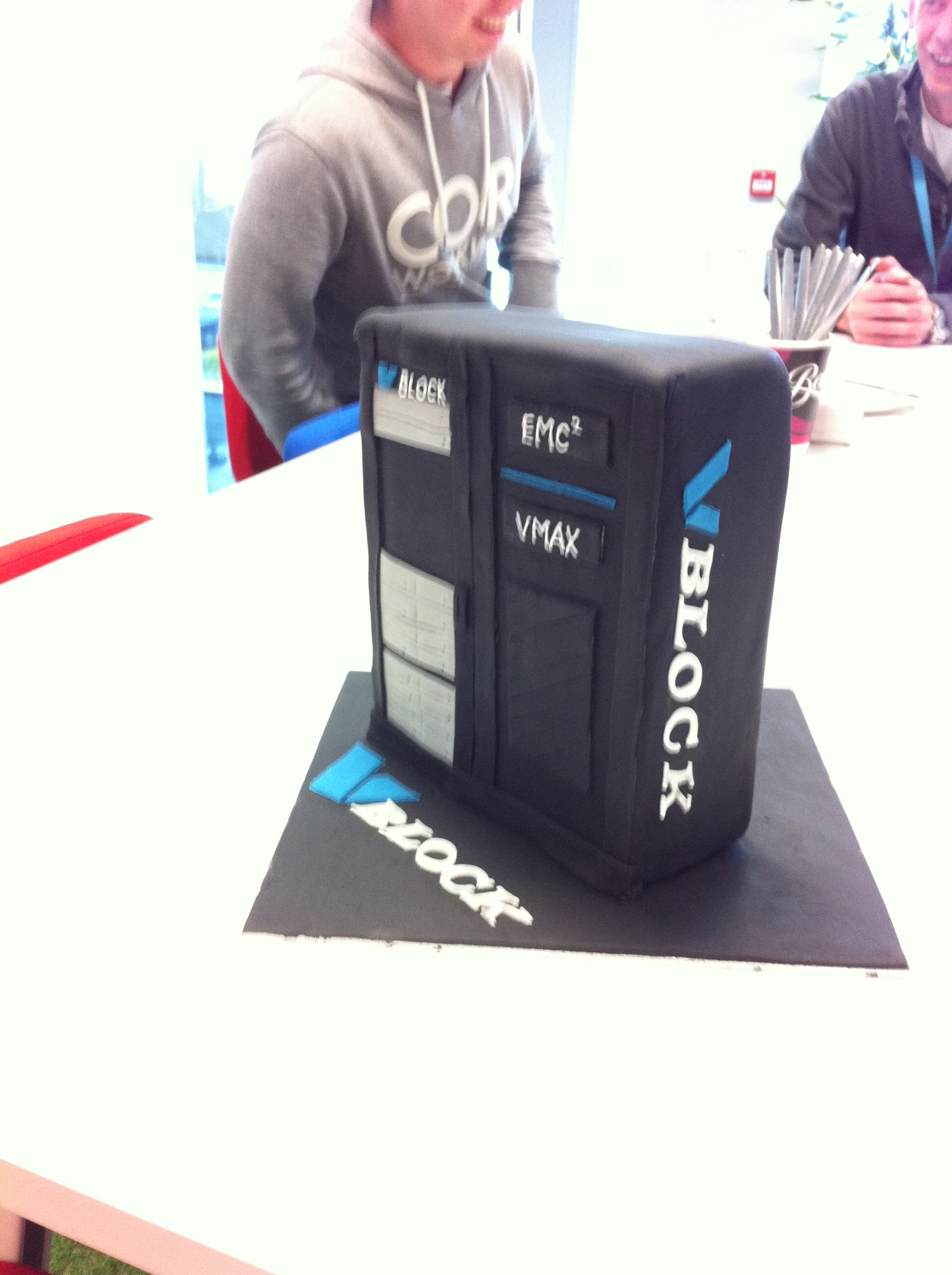 In conjunction with the announcement of the ‘Vblock 740’ @VCE’s latest addition to the Vblock range Cliff kindly put his creative and baking skills to good effect by creating the ‘Vblock 740 vCake’. The Vblock System 740 is VCE’s flagship converged infrastructure, an IT infrastructure built on industry-leading technology combining Network and Compute components from Cisco, Storage in the form of the EMC VMAX³ and virtualization from VMWare – all market leaders in their respective technology sectors.