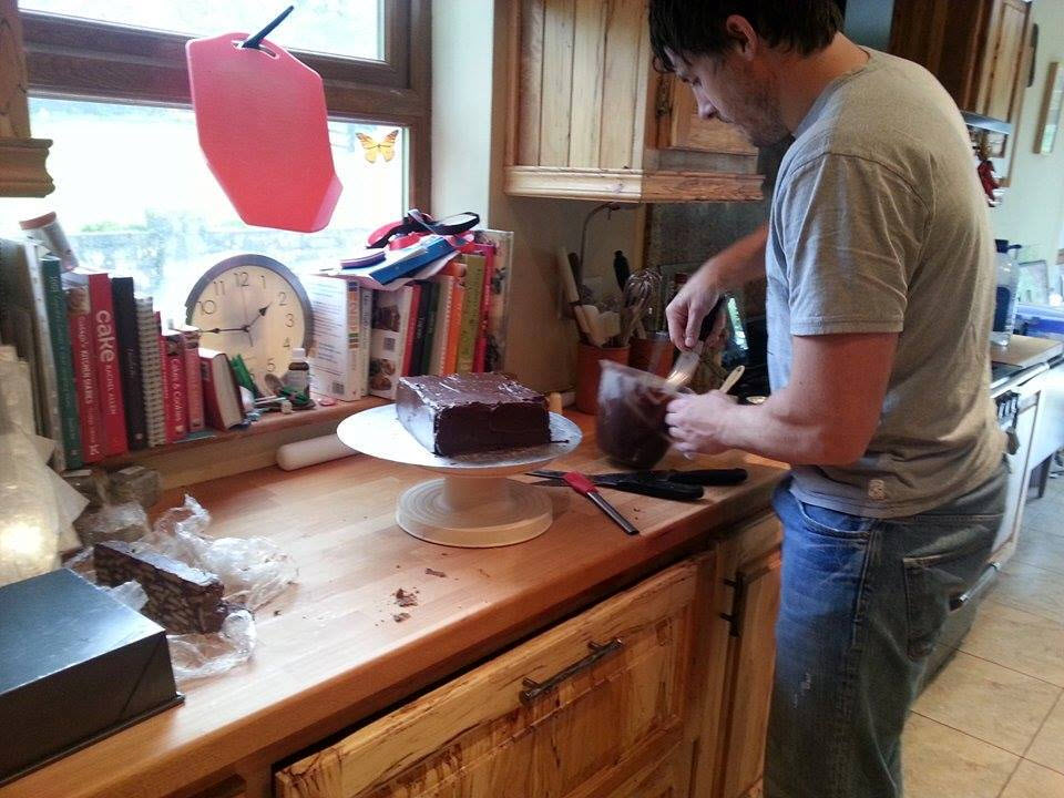 Slowly Bring cream and butter to the boil and poor over dark chocolate.