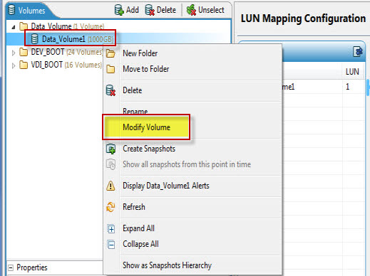 By right clicking the volume you are presented with an option to “Modify Volume”: