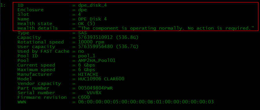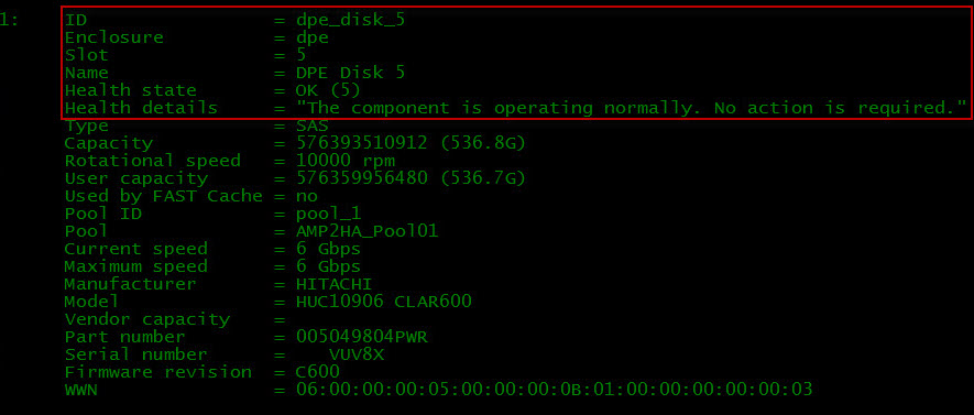 uemcli -d VNXe_IP -u Local/admin -p Password /env/disk -id dpe_disk_5 -detail