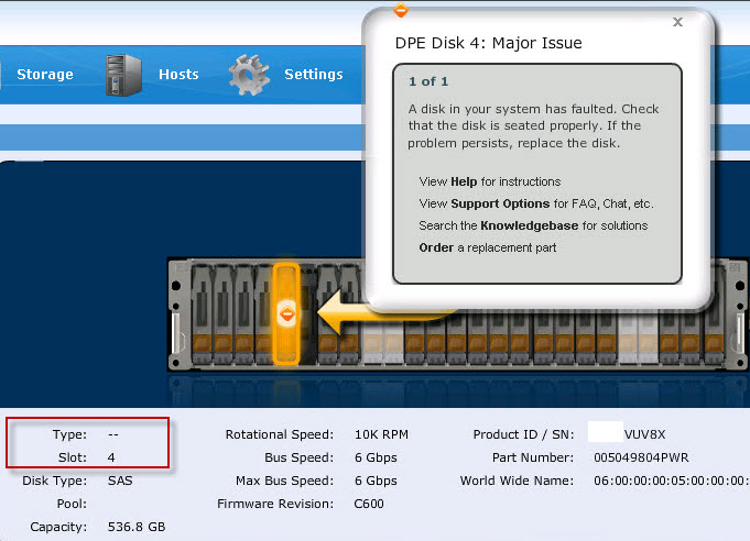After the relocation of the drive (to SLOT-4 in this example) UNISPHERE will temporarily display a warning: