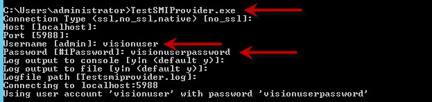 Again from a Windows cmd prompt session as admin user, if the environment variable has not been set then you will need to ‘cd’ to c:\Program Files\EMC\ECIM\ECOM\BIN. Type TestSMIProvider.exe at the prompt, from here chose all defaults except for the Vision user and password created through the ECOM console: