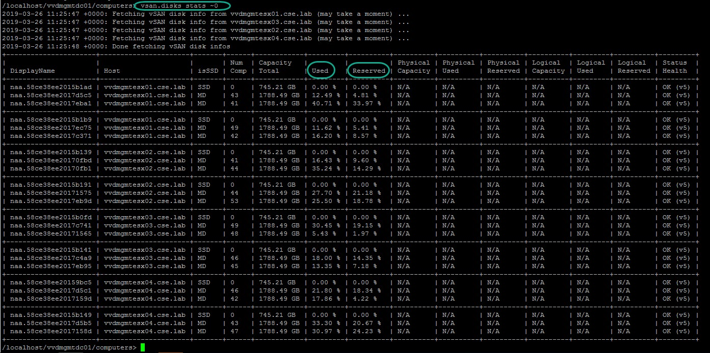By using LS on the computers directory we can see that we have one ESXi cluster (0 vvdcl01-mgmt01), we can leverage the vsan.disks_stats to display disk capacity details for all disks associated with this cluster and their associated ESXi host. Using the ~0 with the cmd as this is the cluster numeric value (the only cluster in this example).