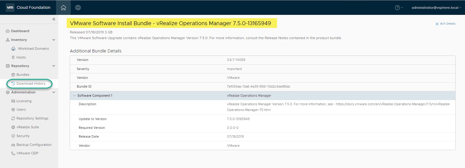 Before we can deploy vROPs we first need to download the the vROps product Binary. From within the SDDC Manager console click Repository->Bundles and download the VMware Software Install Bundle – vRealize Operations Manager 7.5.0-13165949: