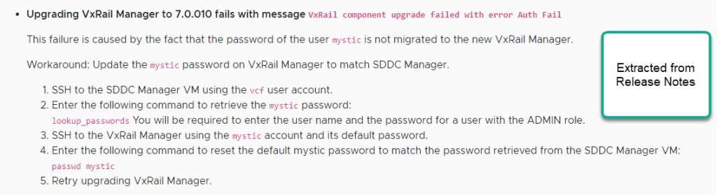 Please also refer to the Release Notes for this known issue: Upgrading VxRail Manager to 7.0.010 fails with message VxRail component upgrade failed with error Auth Fail VMware Cloud Foundation 4.0.1 […]