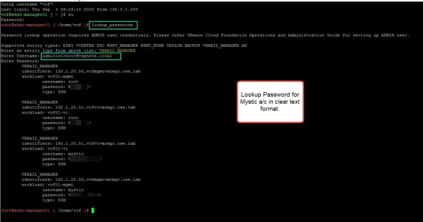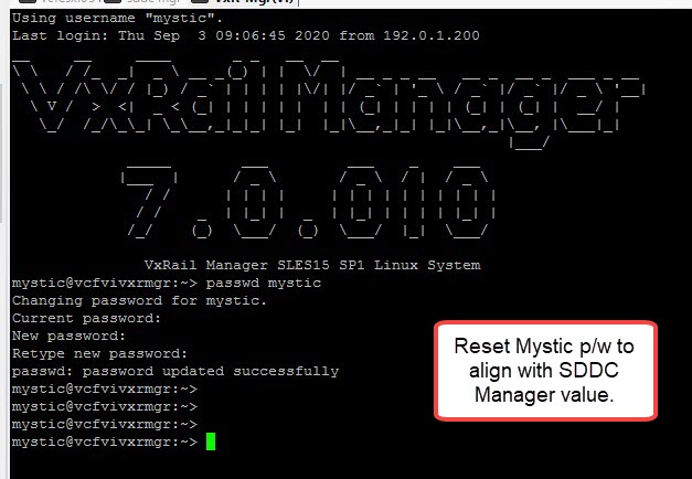 Execute the command ‘passwd mystic’ to reset the mystic user password and set it as per the obtained value from SDDC Manager.