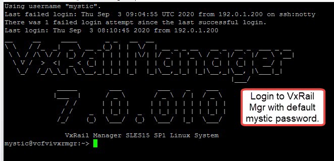 Next SSH to VxRail Manager using mystic account and factory default password: