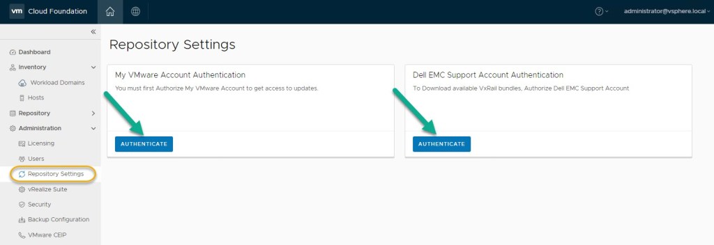 Note: ensure ‘My VMware’ creds are entered successfully in the SDDC Manager repository settings and the list of available products are being displayed in the SDDC Manager repository.