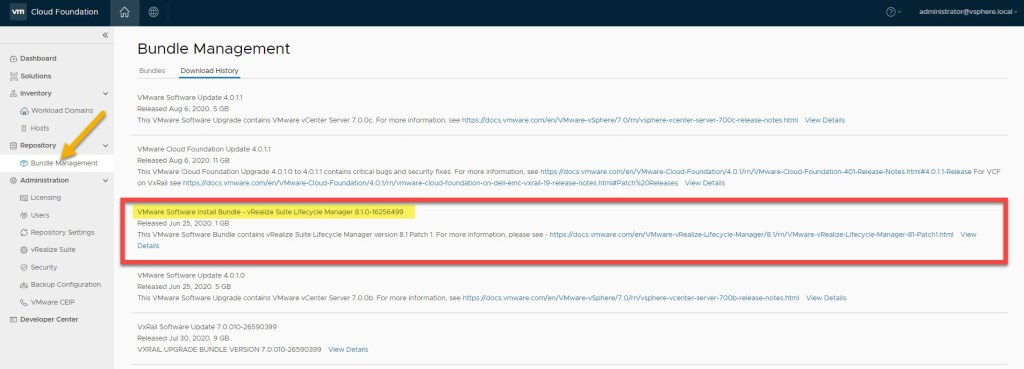 Before we can deploy vRSLCM we first need to download the the vRSLCM product Binary. From within the SDDC Manager console click Repository->Bundle Management and download the VMware Software Install Bundle – vRealize Suite Lifecycle Manager 8.1.0: