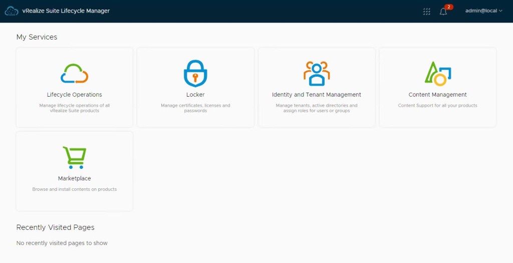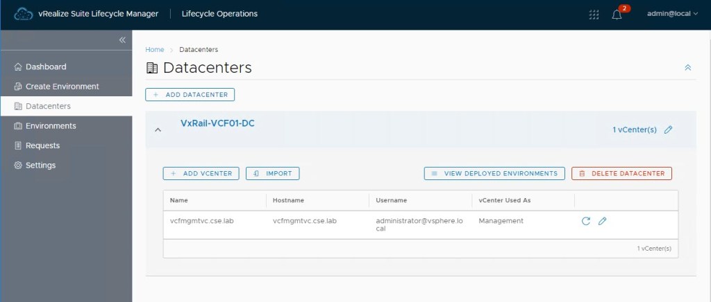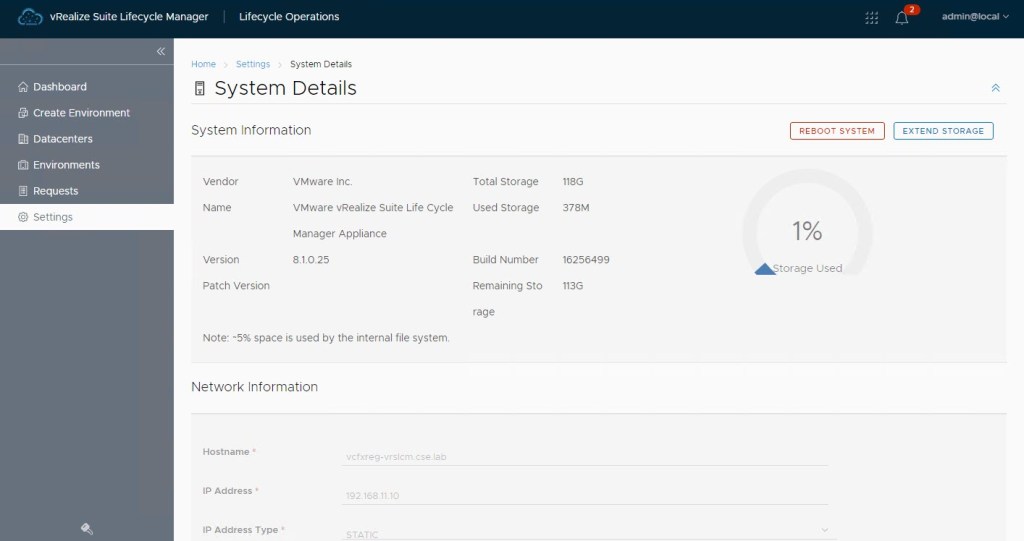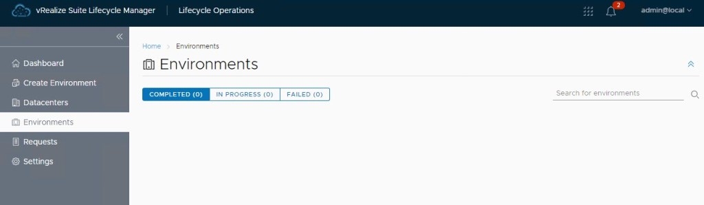 The vRSLCM console opens and from here we can see the config and imports applied as part of the SDDC Mgr deployed vRSLCM: