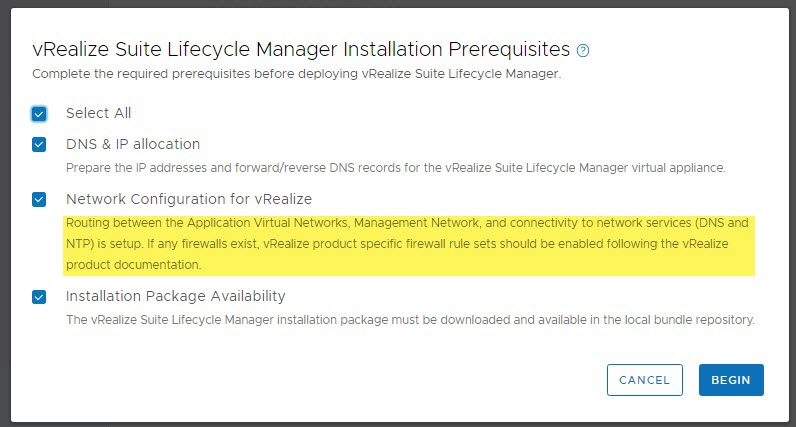 Once you have validated that the required pre-reqs are met using tools such as nslookup to check forward/reverse DNS records and confirming the AVN is routable to the management network, then click BEGIN: