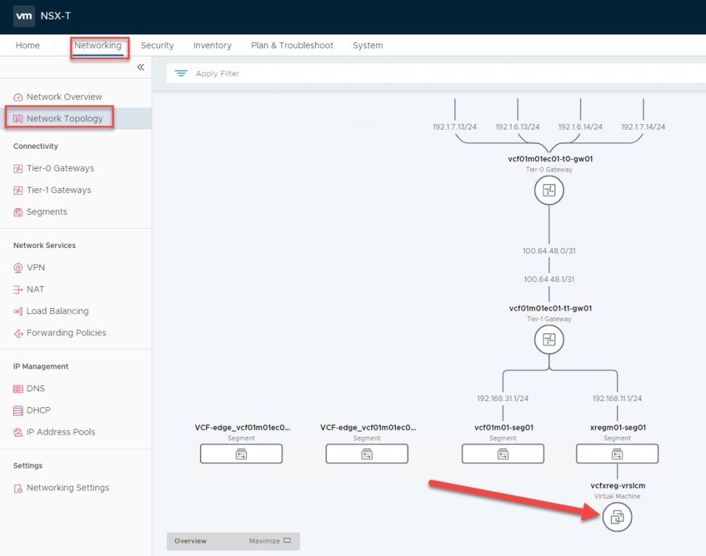 Network topology view from NSX-T manager UI details the Application Virtual Network including the two NSX-T Edge virtual appliances in the management workload domain to support upstream connectivity for the AVN (the 2 edges are hosting the T0&1 G/W’s):