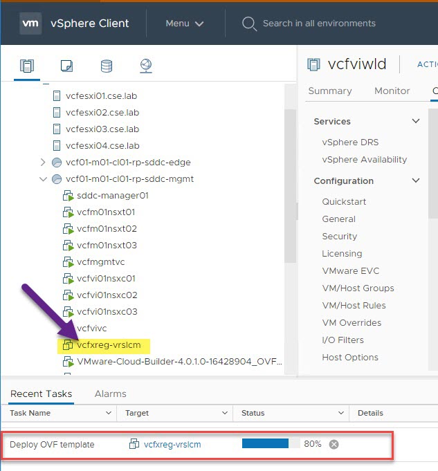 Deployment in progress. Click on task and open the deploy vRSLCM task to track progress of the installation: