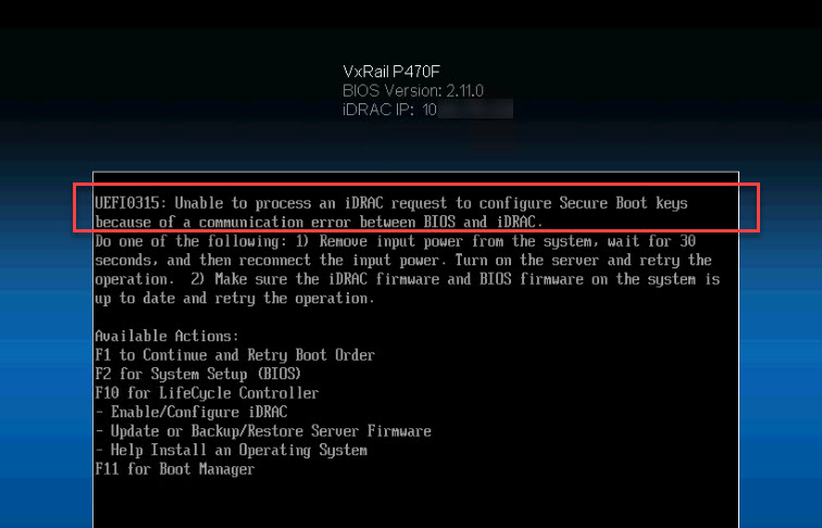 UEFI0315: Unable to process an iDRAC request to configure Secure Boot keys because of a communication error between BIOS and iDRAC.