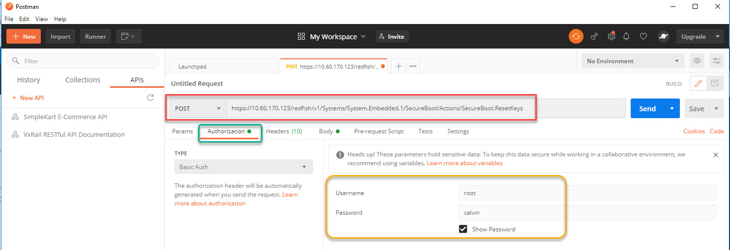 The following procedure resets the Secure Boot Keys using Redfish API. If you are using Secure Boot then ensure to backup the keys before proceeding.