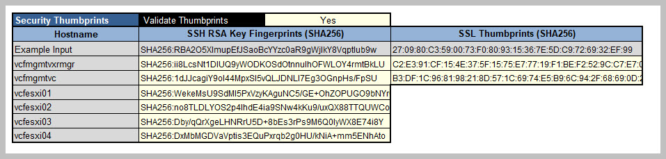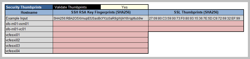 ssh-keygen -lf <(ssh-keyscan vcfesxi01.cse.lab 2>/dev/null)ssh-keygen -lf <(ssh-keyscan vcfesxi02.cse.lab 2>/dev/null)ssh-keygen -lf <(ssh-keyscan vcfesxi03.cse.lab 2>/dev/null)ssh-keygen -lf <(ssh-keyscan vcfesxi04.cse.lab 2>/dev/null)Populating the VCF On VxRail Deployment Parameter Workbook with the respective prints: