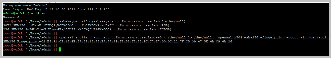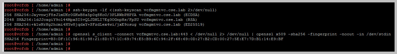 ssh-keygen -lf <(ssh-keyscan vcfmgmtvxrmgr.cse.lab 2>/dev/null)openssl s_client -connect vcfmgmtvxrmgr.cse.lab:443 < /dev/null 2> /dev/null | openssl x509 -sha256 -fingerprint -noout -in /dev/stdinvCenter prints (FQDN in this example is vcfmgmtvc.cse.lab):