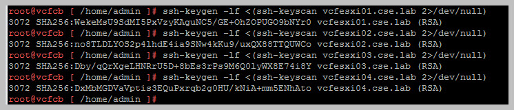 ssh-keygen -lf <(ssh-keyscan vcfmgmtvc.cse.lab 2>/dev/null)openssl s_client -connect vcfmgmtvc.cse.lab:443 < /dev/null 2> /dev/null | openssl x509 -sha256 -fingerprint -noout -in /dev/stdinESXi Hosts SSH Fingerprints :