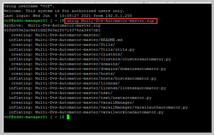 Begin by downloading the multi-dvs python script from within the SDDC Manager UI ‘Developer Center’, followed by using SCP to copy the script over to SDDC Manager /home/vcf/ directory and then performing an unzip action: