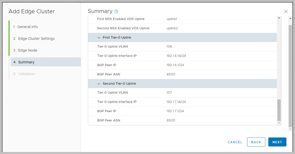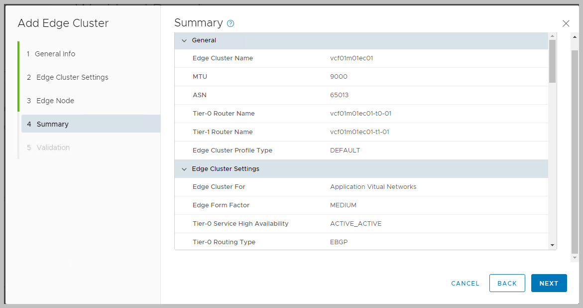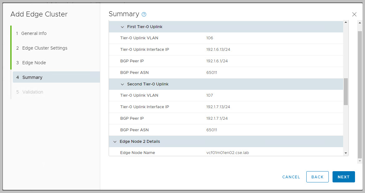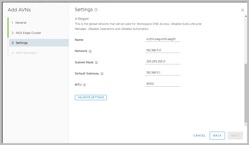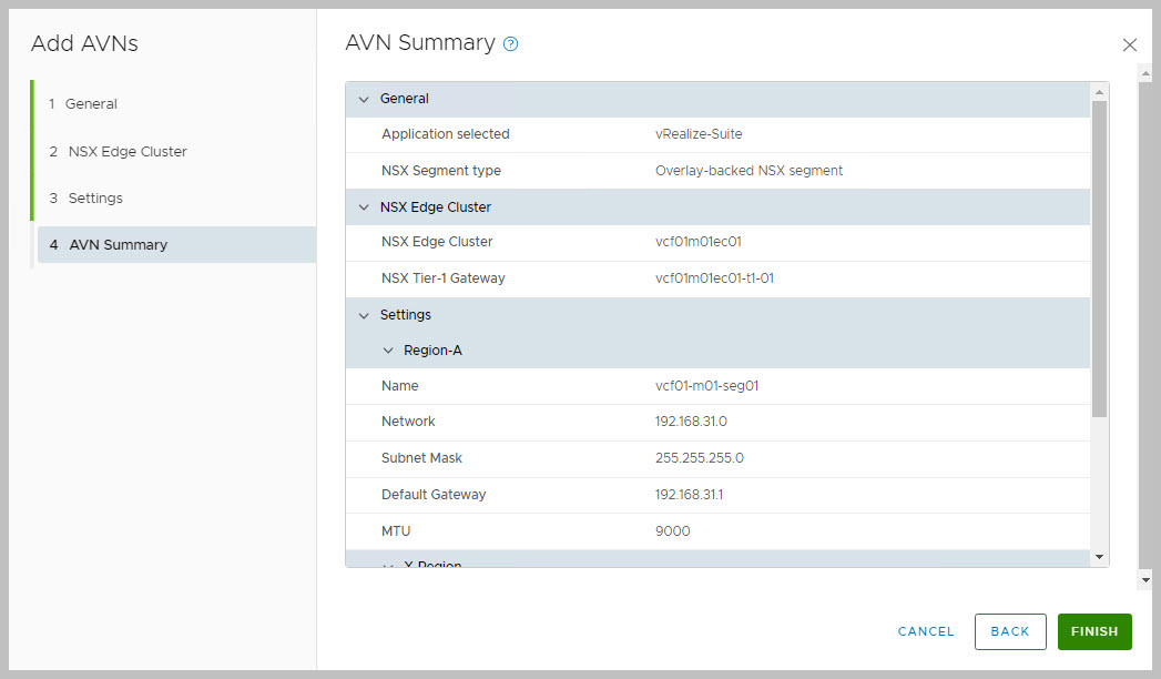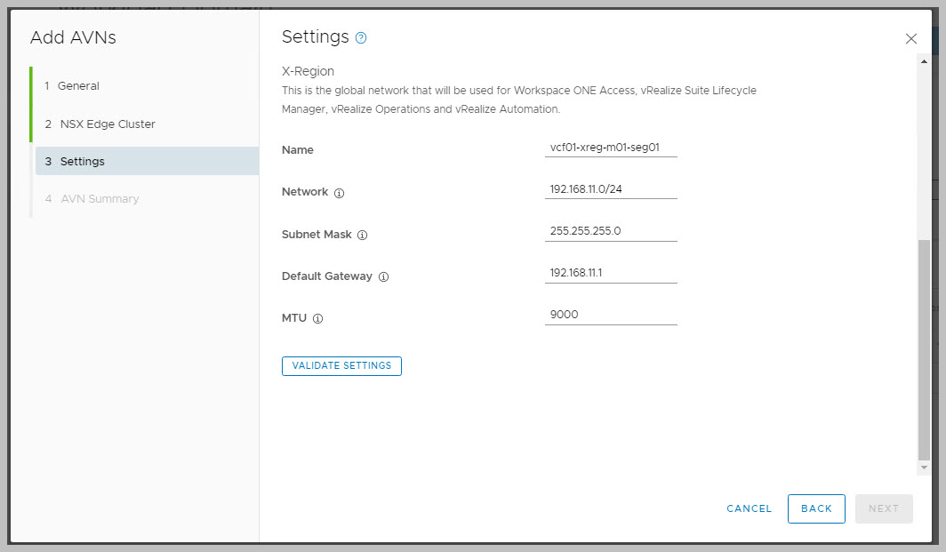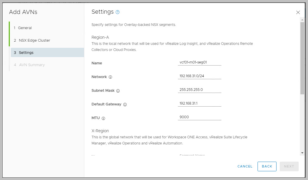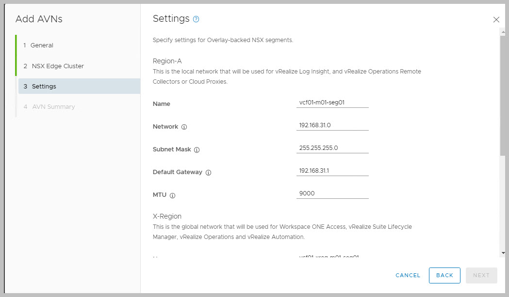 Application Virtual Networks (AVNs) are a requirement in order to support the deployment of the vRealize Suite set of products. AVNs are dependent on NSX-T edge gateways having being deployed in the management WLD as a pre-requisite. The following steps detail how to deploy an NSX-T Edge cluster followed by deploying AVNs leveraging SDDC Manager automation. Required details for the deployment include the usual DNS entries, FQDN, IP Addresses, BGP autonomous system number (ASN) and BGP passwords: