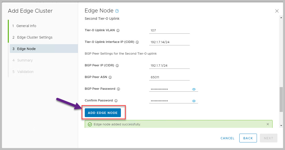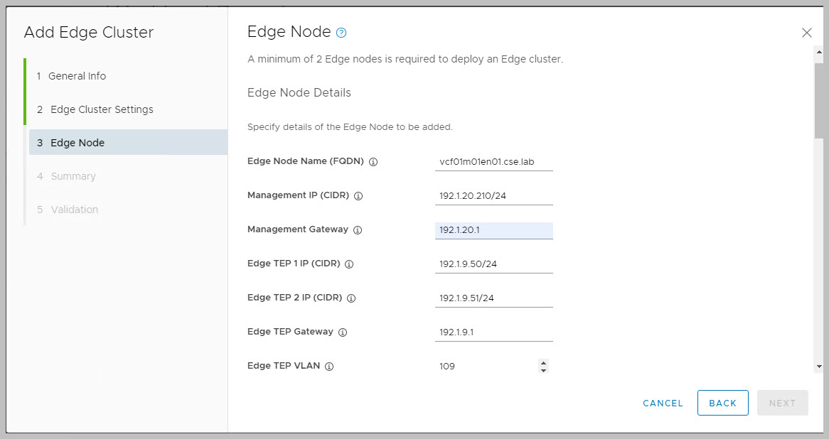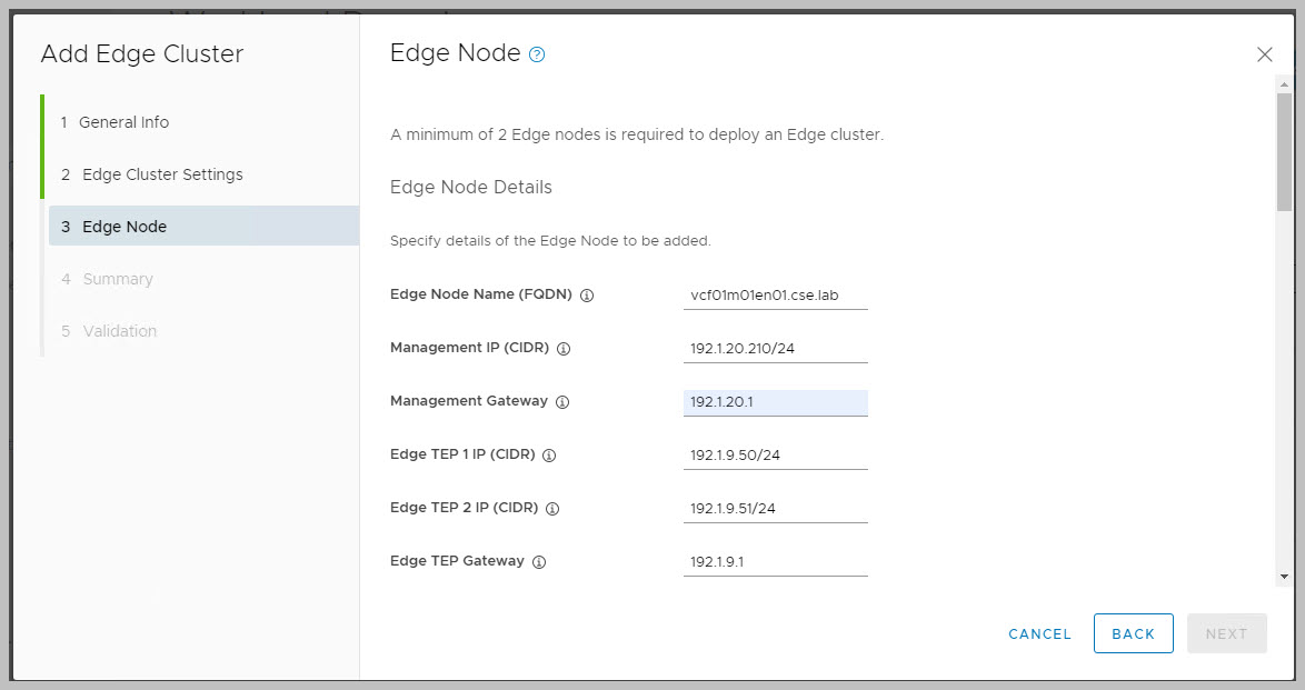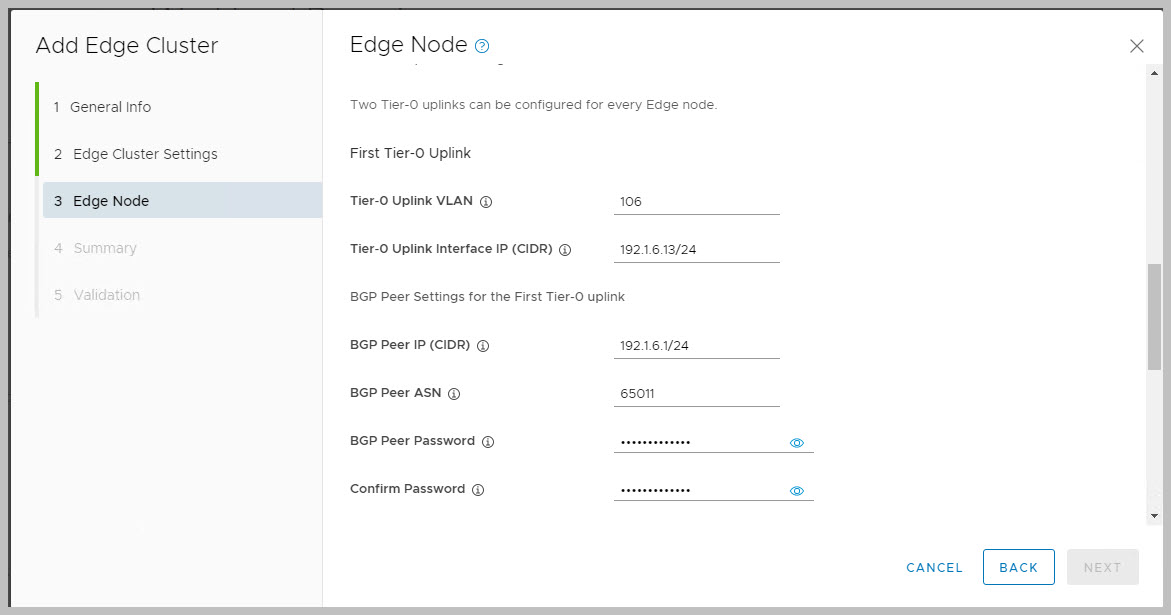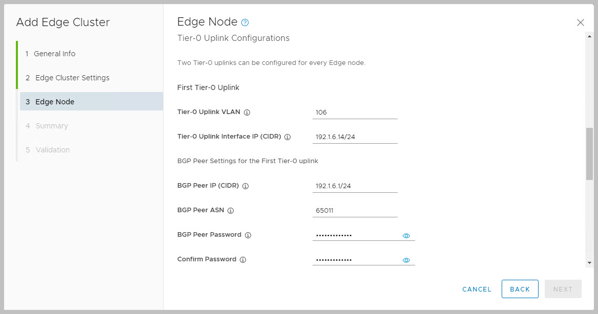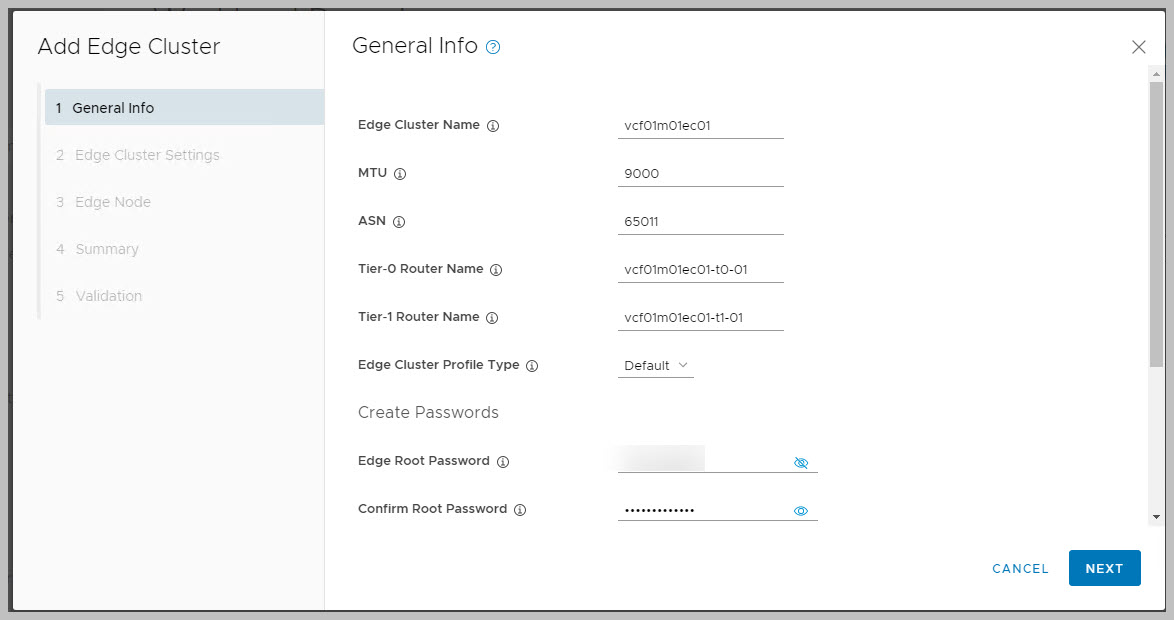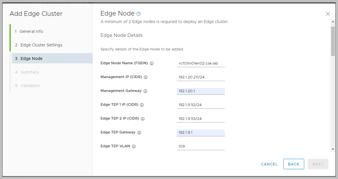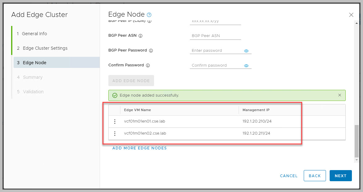 Application Virtual Networks (AVNs) are a requirement in order to support the deployment of the vRealize Suite set of products. AVNs are dependent on NSX-T edge gateways having being deployed in the management WLD as a pre-requisite. The following steps detail how to deploy an NSX-T Edge cluster followed by deploying AVNs leveraging SDDC Manager automation. Required details for the deployment include the usual DNS entries, FQDN, IP Addresses, BGP autonomous system number (ASN) and BGP passwords: