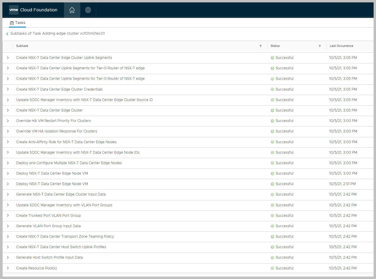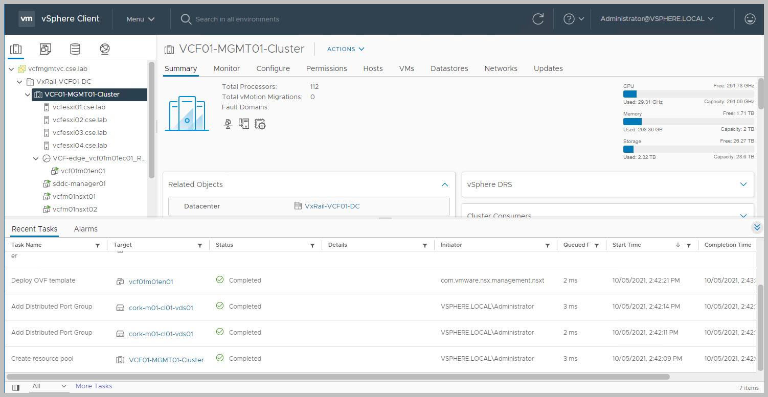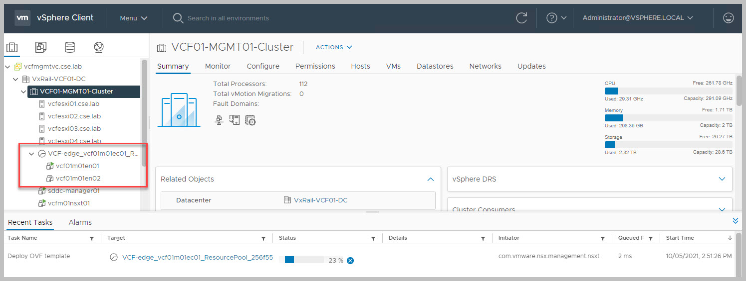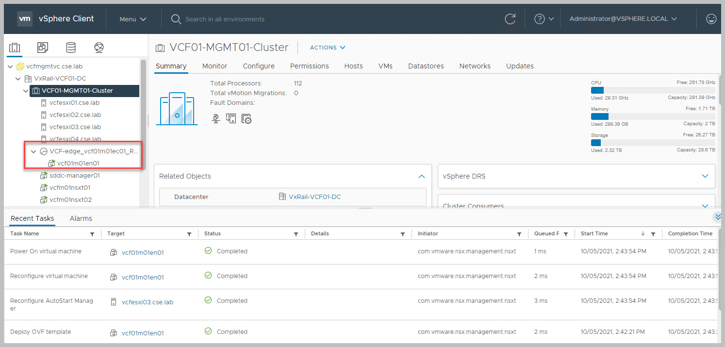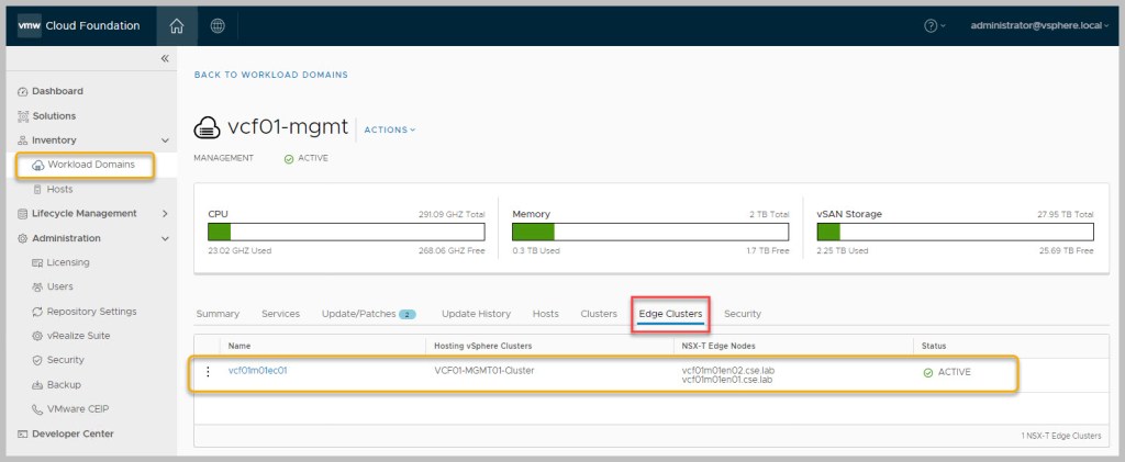 On completion we can view the newly deployed and configured Edge Cluster from both the vCenter & SDDC Manager UI: