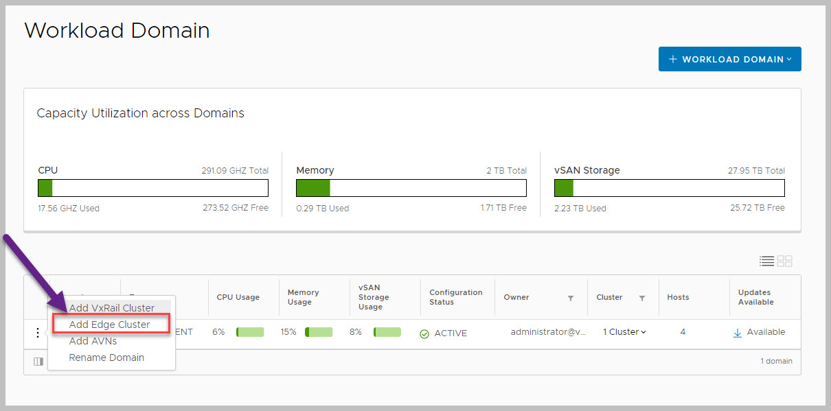 Goto SDDC Manager UI Select Inventory > Workload Domains Click on the name of the Management domain. Select Actions > Add Edge Cluster: