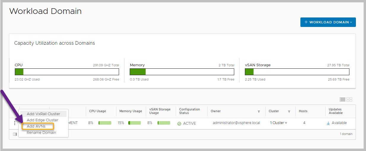 Go to SDDC Manager UI Select Inventory > Workload Domains. Click on the name of the Management domain Select Actions > Add AVNs: