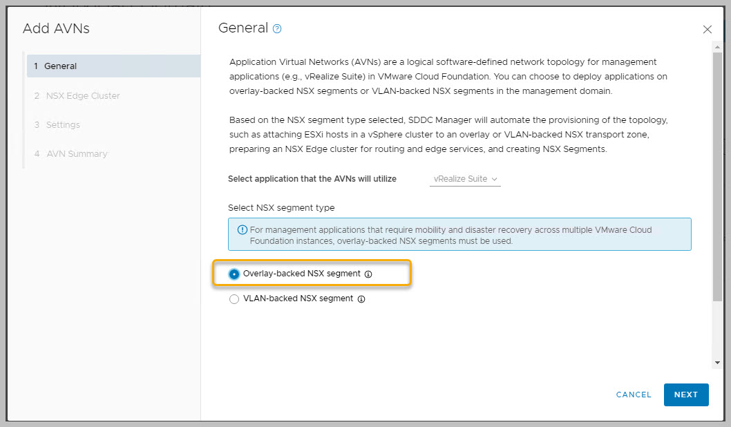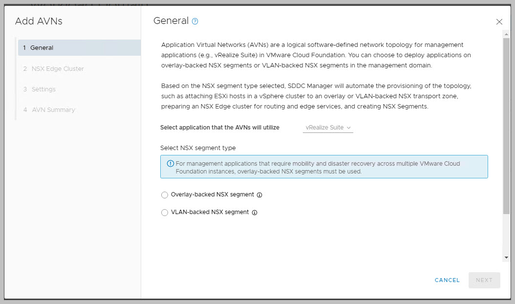 ‘Flexibility in Application Virtual Networks (AVN): Application Virtual Networks(AVN)s, which include the NSX Edge Cluster and NSX network segments, are no longer deployed and configured during bring-up. Instead they are implemented as a Day-N operations in SDDC Manager, providing greater flexibility.’