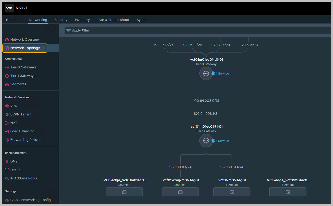 The following depicts the architectural view from within NSX-T manager for the Edge solution. The Tier-0 gateway provides routing to the external network while the Tier-1 connected to Tier-0 provides the N/S comms for the internal network.