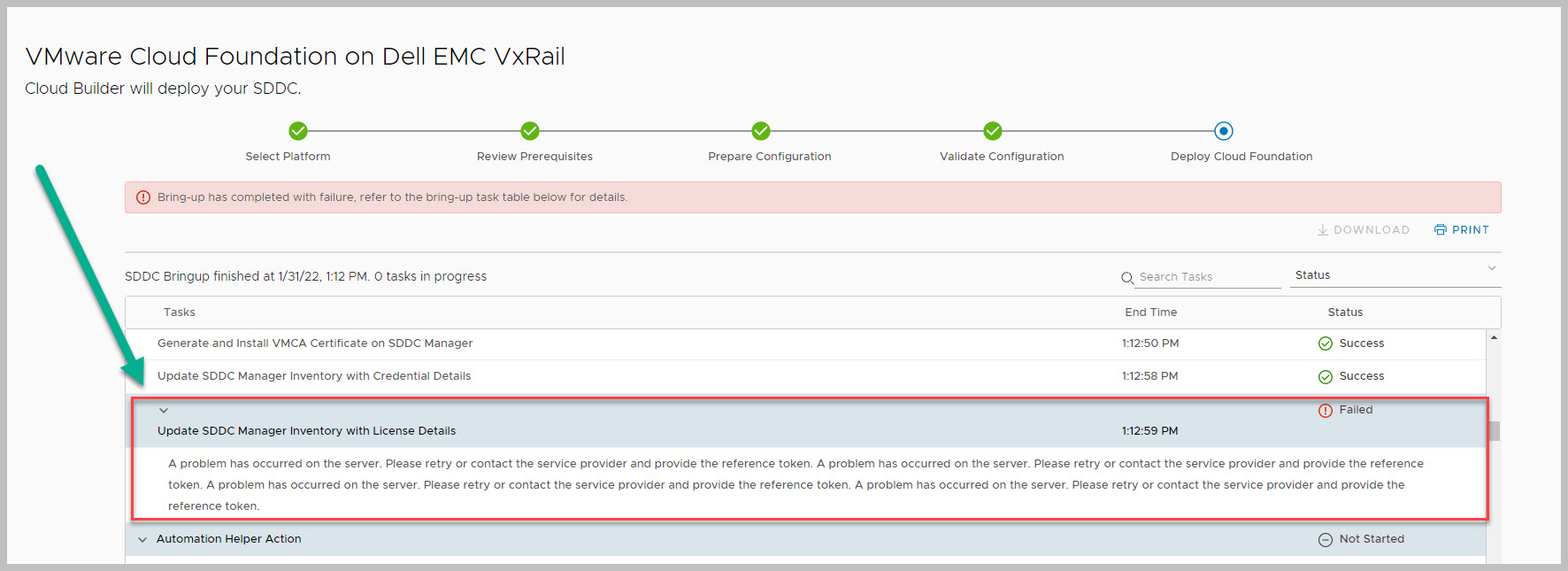 Issue: NSX Datacenter license used in parameter xls was expired, resulting in a failure during bring-up.