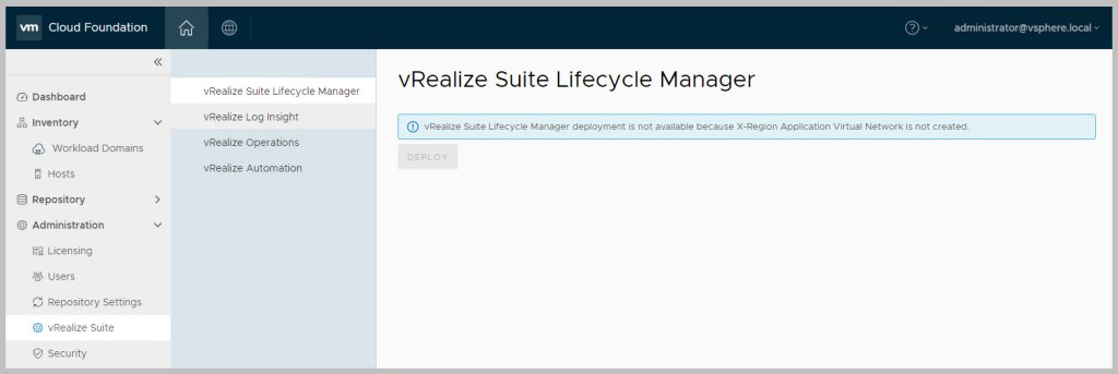 In this scenario I upgraded from 3.10 to 3.11 in advance of deploying vRSLCM; this required me to reset feature.vcf.avn.freenfield to status of ‘true’: