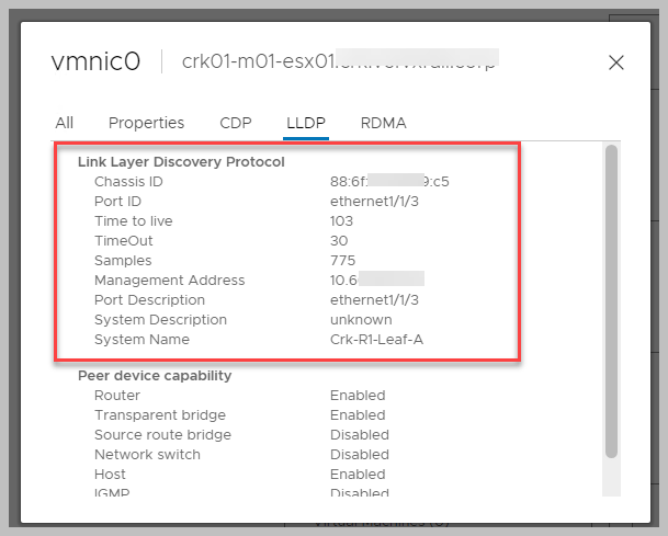 We can now view the LLDP information for the VxRail hosts physical adapters & the DELL switch corresponding details: