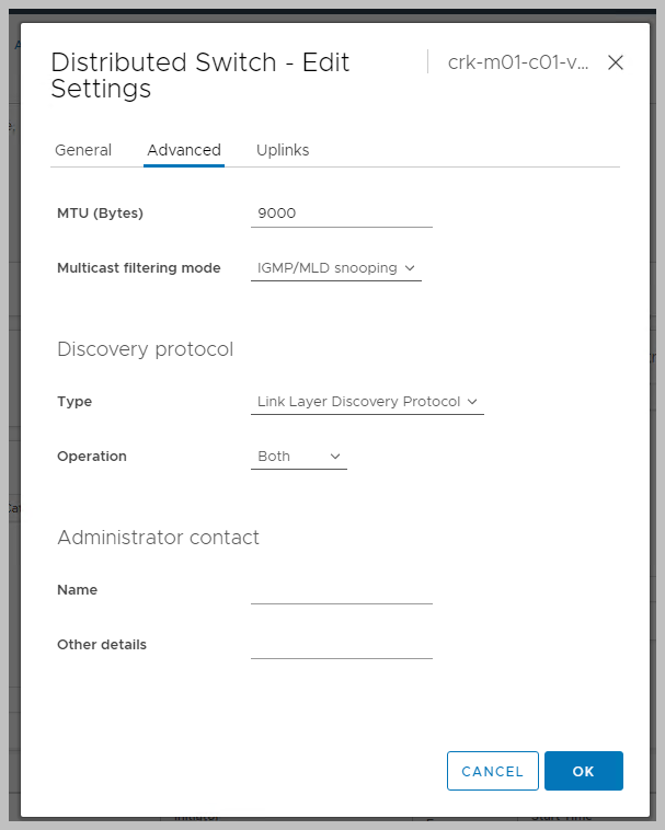 Log in to vCenter and select the Networking tab and right-click the vDS. Navigate to Settings and click on Edit Settings select Advanced. Now Set the discovery protocol to Link Layer Discovery Protocol and select Both: