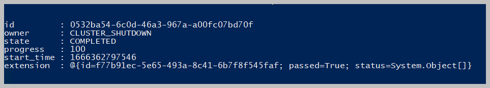 { "id": "3efe835d-5f89-4197-9223-4ab572ceaf1a", "owner": "CLUSTER_SHUTDOWN", "state": "COMPLETED", "progress": 100, "start_time": 1666345433469, "extension": { "id": "1da7c85e-0549-4017-a3f1-e59377e0d751", "passed": true, "status": [ { "ignorable": true, "label": "Check and ensure that cluster health monitoring is on.", "message": "Success", "checkResult": "PASSED" }, { "ignorable": true, "label": "Check and ensure that the host(s) aren't in maintenance mode", "message": "Success", "checkResult": "PASSED" }, { "ignorable": true, "label": "Check and ensure that the hosts are connected", "message": "Success", "checkResult": "PASSED" }, { "ignorable": false, "label": "Check and ensure that all customer virtual machines have been shut down", "message": "Success", "checkResult": "PASSED" }, { "ignorable": true, "label": "Check and ensure that File Service is disabled", "message": "Success", "checkResult": "PASSED" }, { "ignorable": true, "label": "Check and ensure that current cluster have no TANZU service.", "message": "Success", "checkResult": "PASSED" }, { "ignorable": true, "label": "Check and ensure that all virtual machines on client cluster have been power off.", "message": "Success", "checkResult": "PASSED" }, { "ignorable": true, "label": "Check and ensure that the time is synchronized between multiple hosts", "message": "Success", "checkResult": "PASSED" }, { "ignorable": true, "label": "Check and ensure that no host is locked down.", "message": "Success", "checkResult": "PASSED" }, { "ignorable": true, "label": "Check and ensure that vSAN is in health state.", "message": "Success", "checkResult": "PASSED" }, { "ignorable": true, "label": "Check and ensure that cluster resync is not ongoing.", "message": "Success", "checkResult": "PASSED" } ] }}