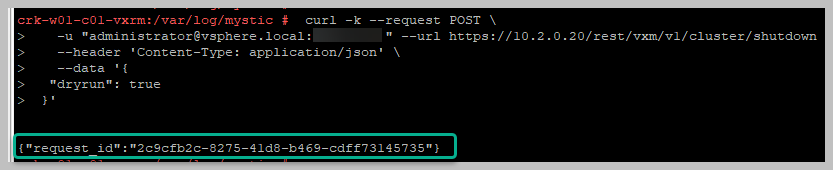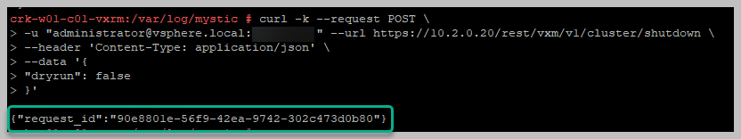 -u "administrator@vsphere.local:password" --url https://10.2.0.20/rest/vxm/v1/cluster/shutdown \