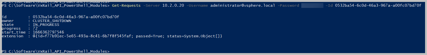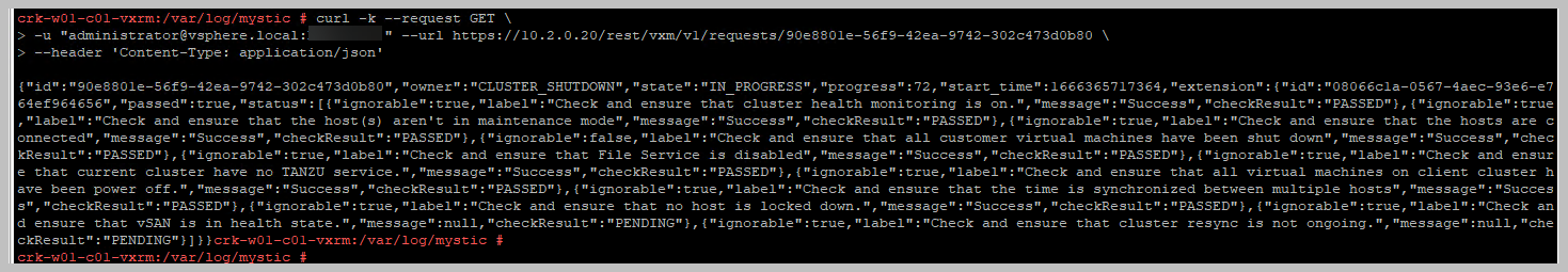 -u "administrator@vsphere.local:password" --url https://10.2.0.20/rest/vxm/v1/requests/90e8801e-56f9-42ea-9742-302c473d0b80 \