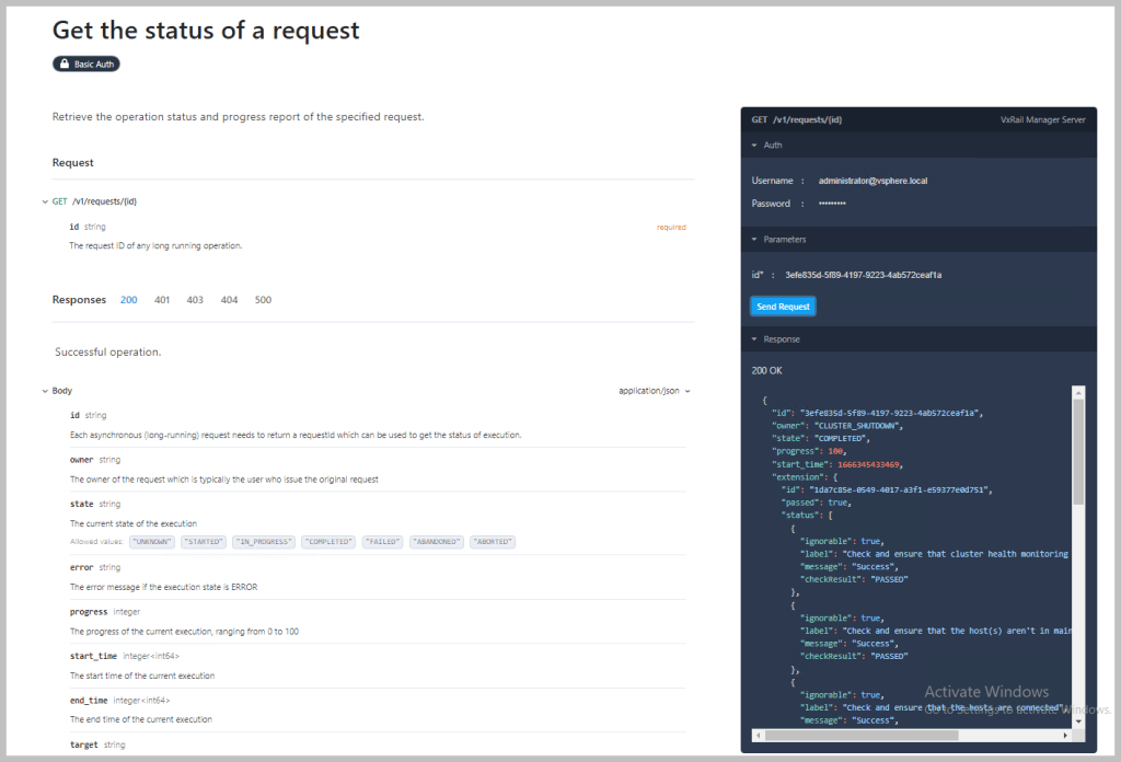 Expanding ‘cluster shutdown’ API function we click on ‘Shut down a cluster or perform a shutdown dry run’, best practice is to perform a dryrun and remediate any encountered issues before proceeding. In the body section replace false with true to activate a dryrun, enter your SSO creds and click ‘Send Request’: